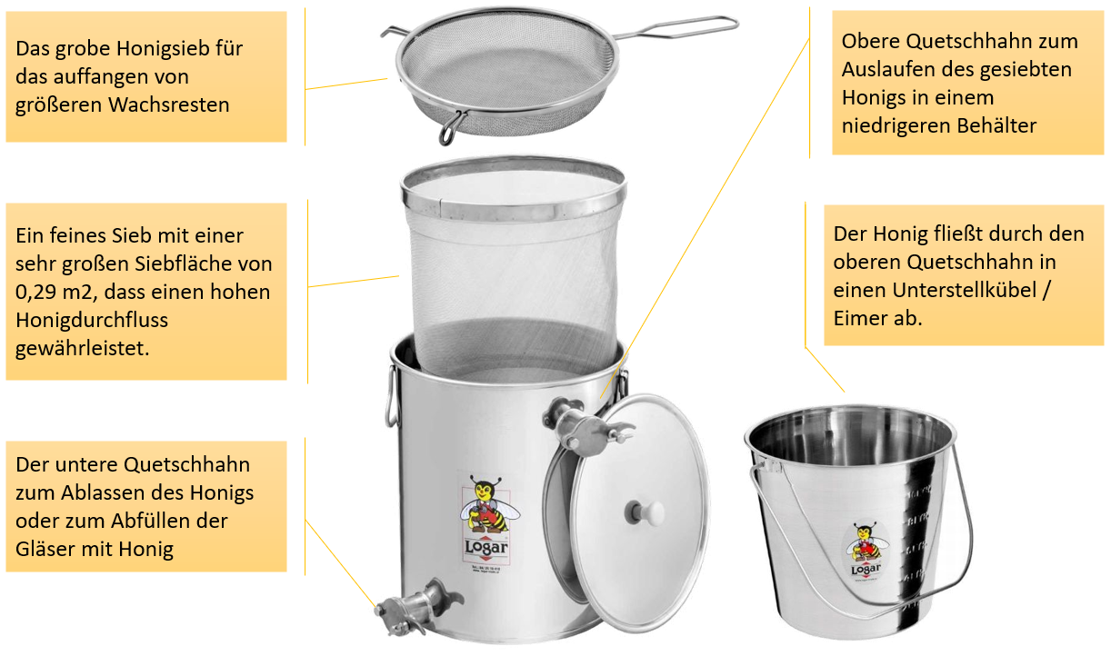 Dzięki dużej wadze miodu i dużej powierzchni sita wewnętrznego pozostałości wosku, zabrudzeń i pyłków zapychają sito w tej wersji pojemnika bardzo powoli — od góry ku dołowi.