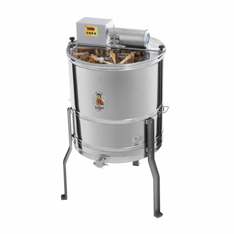 12-ramkowa wirówka radialna firmy Logar, z napędem 110 W/230 V, w pełni elektronicznym sterowaniem i zintegrowanym wyłącznikiem bezpieczeństwa, który automatycznie zatrzymuje silnik po otwarciu pokrywy. Nowoczesna konstrukcja pozwoliła na innowacyjne wykonanie dna kadzi: dno jest bezszwowo zespawane i nachylone w kierunku wylewu. Nierdzewny kran miodowy jest przespawany w możliwie najniższym punkcie, aby cały miód mógł swobodnie spłynąć z wirówki. Wszystkie elementy mające kontakt z miodem wykonane są z materiałów dopuszczonych do kontaktu z żywnością. Pokrywa wykonana jest z przezroczystego akrylu. Specjalna konstrukcja nóżek zapewnia stabilne podparcie urządzenia.