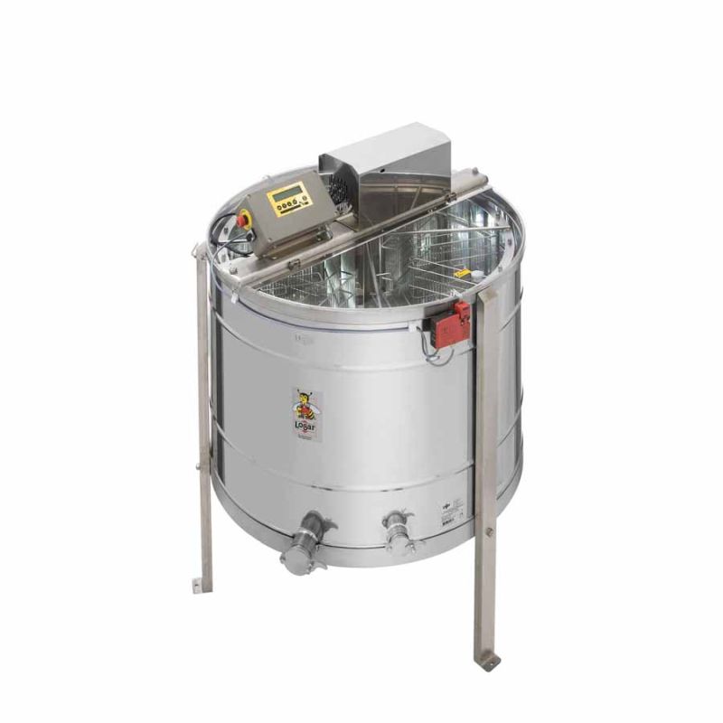 Sześcio‑ramkowa samoobracająca wirówka firmy Logar z napędem elektrycznym 370 W / 230 V i w pełni automatycznym sterowaniem. Wirówka jest wyposażona we wbudowane zabezpieczenie, które automatycznie wyłącza silnik po otwarciu pokrywy. Nowoczesne wykonanie dna misy: bezszwowo spawane i pochylone w kierunku wylotu, co zapewnia bardzo dobre spływanie miodu.