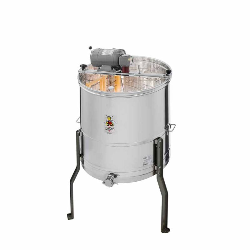 4-ramkowa wirówka do miodu, uniwersalna, z napędem elektrycznym 110 W / 230 V i wbudowanym wyłącznikiem bezpieczeństwa, który automatycznie zatrzymuje silnik po otwarciu pokrywy. Najnowsze rozwiązania techniczne pozwoliły na innowacyjne wykonanie dna zbiornika wirówki. Dno zbiornika jest bezszwowo zespawane i nachylone w kierunku kranu miodowego. Stalowy, nierdzewny kran miodowy jest zespawany w możliwie najniższym punkcie, tak aby cały miód mógł wypływać ze zbiornika.